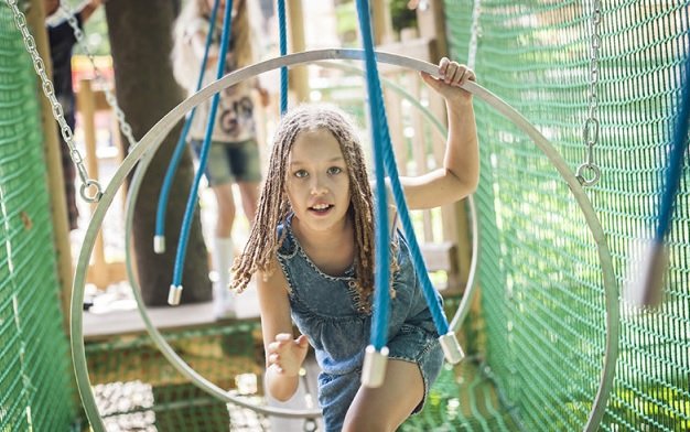 Na dorosłych czeka ekscytująca, licząca ok. 1000 m i 20 stacji trasa rozciągająca się między drzewami. Balansowanie na pomostach, pokonywanie przeszkód, zjazdy tyrolskie, a przede wszystkim niesamowite widoki i odrobina adrenaliny – wszystko to zapewnia wyprawa do naszego parku linowego.